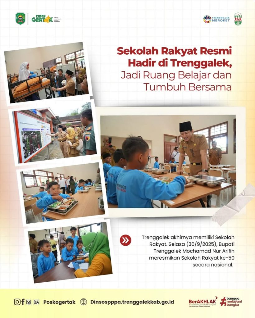 Trenggalek akhirnya memiliki Sekolah Rakyat. Selasa (30/9/2025), Bupati Trenggalek Mochamad Nur Arifin meresmikan Sekolah Rakyat ke-50 secara nasional. Peresmian ini tidak hanya dilakukan secara seremonial, tetapi juga diwarnai dengan momen istimewa ketika Bupati bersama Forkopimda dan tamu undangan mengantarkan langsung 69 peserta didik menuju sekolah barunya.